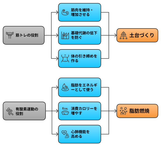 筋トレで体内の糖が消費されると、その後の有酸素で脂肪がエネルギーとして使われやすくなります。